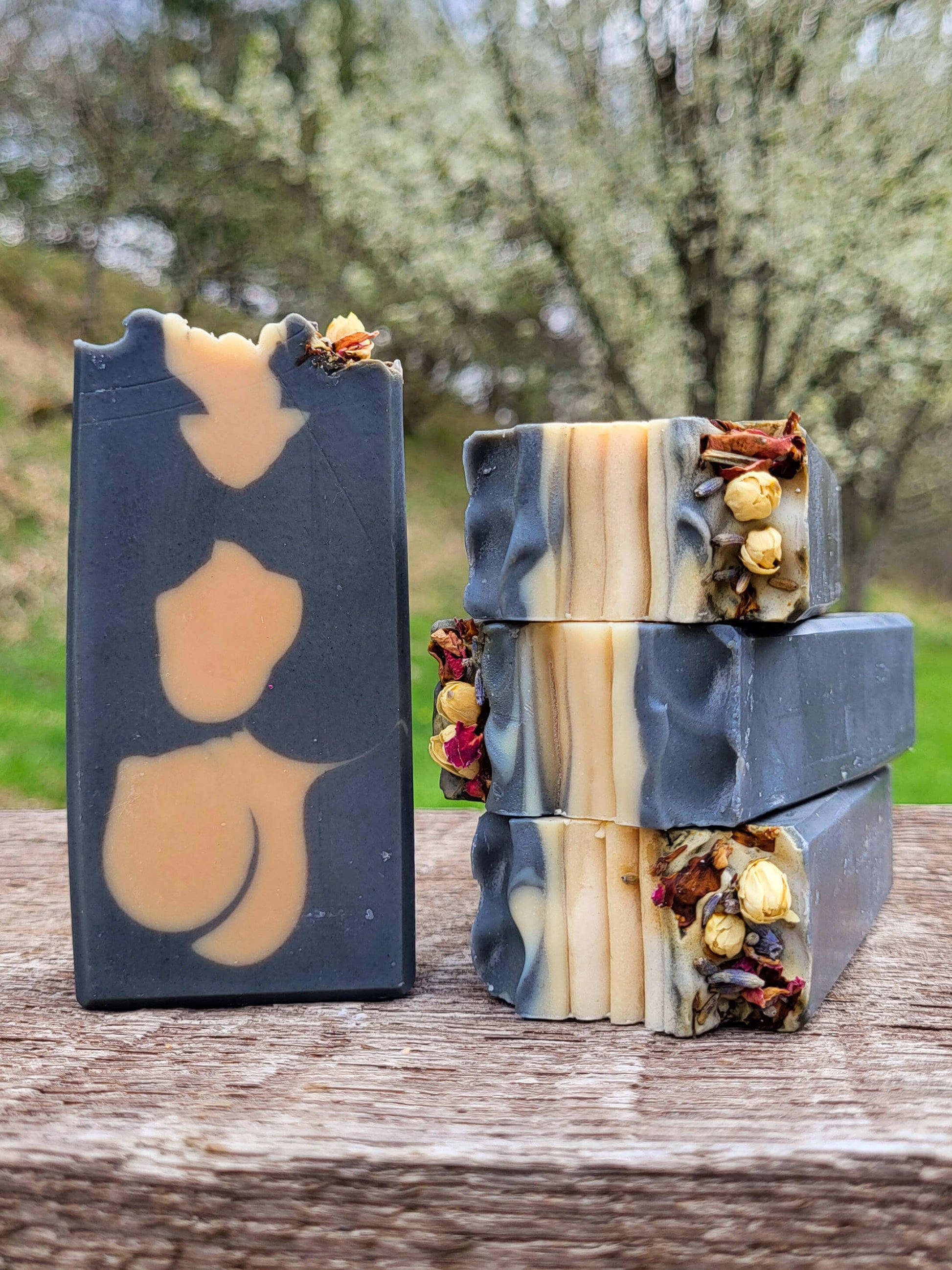 Lard, Rice Bran Oil, Organic Extra Virgin Coconut Oil, Food Grade Lye, Organic Avocado Oil, Organic Castor Oil, Lavender Essential Oil, Local Raw Honey, Patchouli Essential Oil, Kaolin Clay, Sea Salt, Activated Charcoal, Jasmine Flowers, Rose Petals, Lavender Buds.